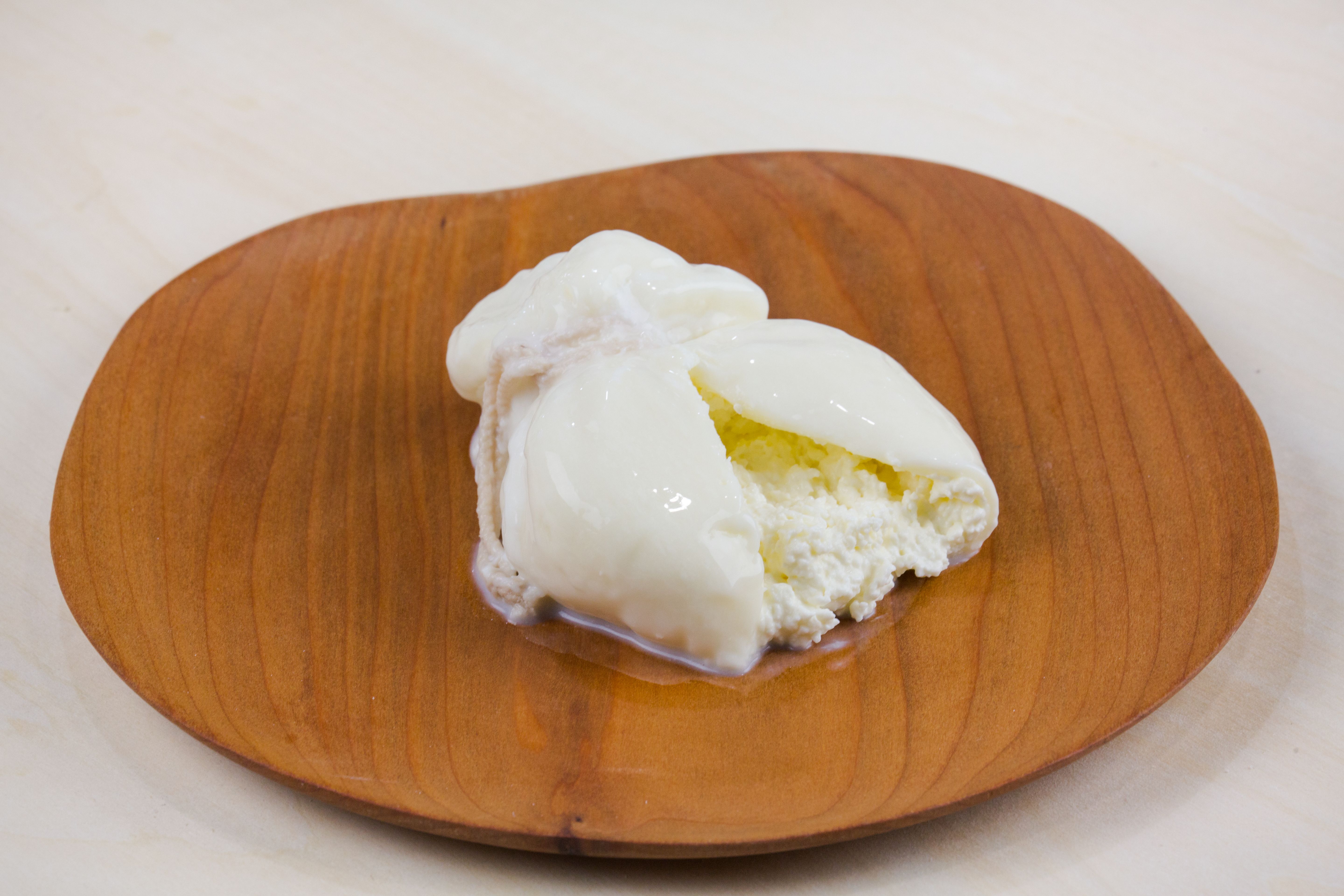 上部をキュッと結んだ可愛らしい巾着型の「二世古 蕾(つぼみ)」。外側は弾力のあるフレッシュなモッツァレラチーズですが、その中には**濃厚でトロトロの生クリーム**がたっぷりと包み込まれています。